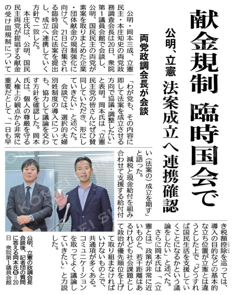 公明党の岡本三成、立憲民主党の本庄知史の両党政調会長は、企業・団体献金の規制強化の法案を本臨時国会で連携して成立を目指すことで一致しました📝