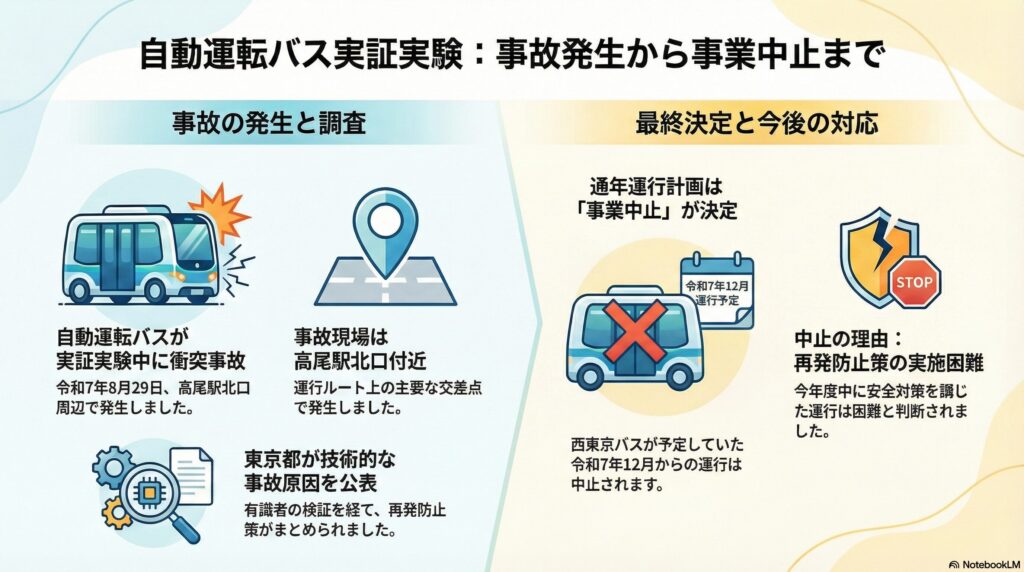 令和7年8月29日、高尾駅北口周辺で実施していた自動運転バスの実証実験において、車両が街路樹に衝突する事故が発生いたしました 。
