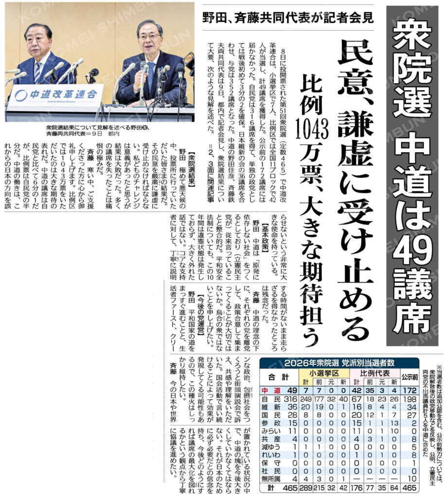 選挙結果を受けて中道2026.02.132026.02.10Tweet寒い中、短期間の選挙戦ではありましたが、比例区、選挙区共に多くの方に真心からの応援を頂きました。心より感謝申し上げます。中道改革連合「49議席」という結果となりましたが、多くの方より頂いた声、政治に対する想いを具体的に形としていけるよう、私自身さらに地域に入り、地域の中で頑張って参ります❗️この度は、本当にありがとうございました。⬇️八王子選挙区の結果⬇️令和8年(2026年)2月8日執行 衆議院議員選挙 投票・開票結果|八王子市公式ホームページTweet