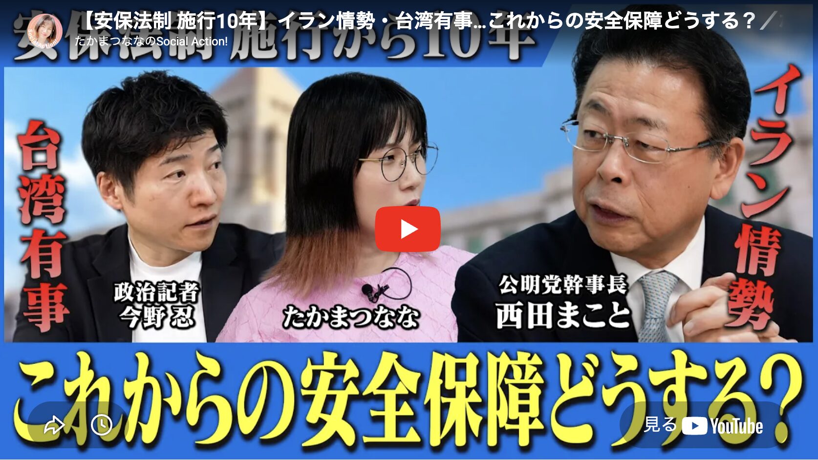 公明党の西田まこと幹事長が、政治記者の今野忍さん、ジャーナリストのたかまつななさんの問いかけに答える形で、安保法制の現在地とこれからの日本の安全保障について率直に語り合っています。